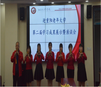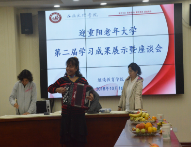 座谈会上,老年大学葫芦丝、声乐、书法、手风琴专业的学员展示了他们的学习成果。