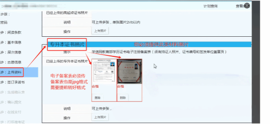 2.专升本需上传毕业证及电子学历注册备案表,高起本需上传高中毕业证书或同等学历证书。单张图片大小均为2M以内,文件格式为jpg。