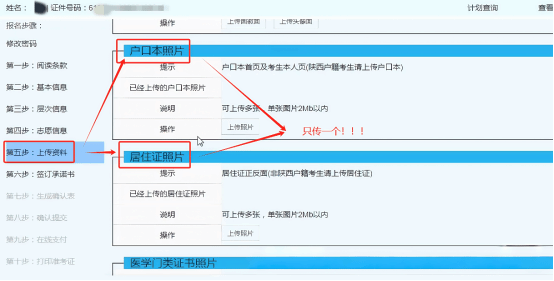 1.专升本/高起本:省内考生上传身份证正反面、户口本首页、本人页。省外考生上传有效期内居住证正反面。单张图片大小均为2M以内,文件格式为jpg。