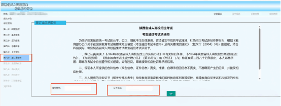 完成考生注册后,选择“考生登录”,使用已经注册的考生身份证号码、登录密码,进行登录报考系统,阅读条款,在底部框内打“√”并下一步。